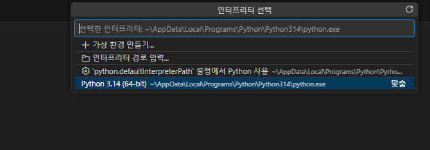 -. Ctrl + Shift + P 눌리면 인터페이스 상단에 입력 창이 뜨는데.. 여기서 select Interpreter 선택